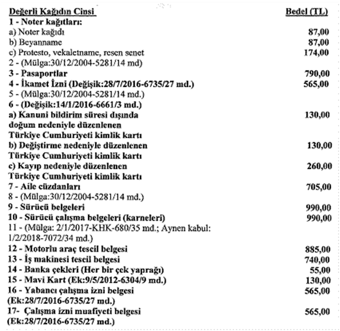 MADDE 3- (1) 210 sayılı Kanuna ekli Değerli Kağıtlar Tablosunda yer alan değerli kağıtların bedelleri aşağıdaki şekilde belirlenmiştir: