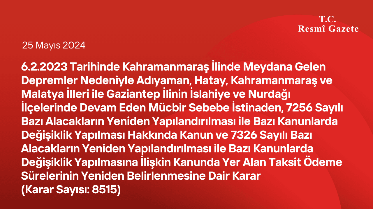 Home»Haberler»6.2.2023 Tarihinde Kahramanmaraş İlinde Meydana Gelen Depremler Nedeniyle Adıyaman, Hatay, Kahramanmaraş ve Malatya İlleri ile Gaziantep İlinin İslahiye ve Nurdağı İlçelerinde Devam Eden Mücbir Sebebe İstinaden, 7256 Sayılı Bazı Alacakların Yeniden Yapılandırılması ile Bazı Kanunlarda Değişiklik Yapılması Hakkında Kanun ve 7326 Sayılı Bazı Alacakların Yeniden Yapılandırılması ile Bazı Kanunlarda Değişiklik Yapılmasına İlişkin Kanunda Yer Alan Taksit Ödeme Sürelerinin Yeniden Belirlenmesine Dair Karar (Karar Sayısı: 8515)