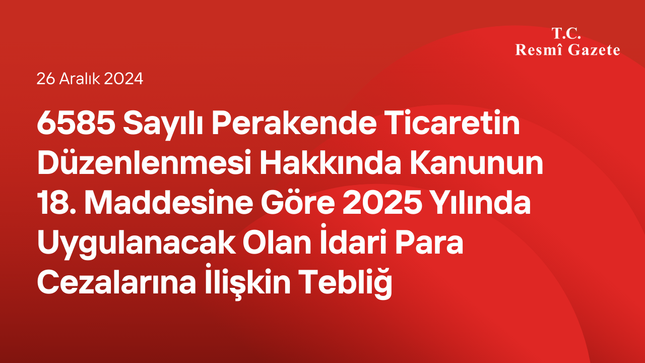 MADDE 1- (1) Bu Tebliğin amacı, 14/1/2015 tarihli ve 6585 sayılı Perakende Ticaretin Düzenlenmesi Hakkında Kanunun 18 inci maddesinde düzenlenmiş olan idari para cezalarının, 27/11/2024 tarihli ve 32735 sayılı Resmî Gazete’de yayımlanan Vergi Usul Kanunu Genel Tebliği (Sıra No: 574)’nde 2024 yılı için yeniden değerleme oranı olarak tespit edilen % 43,93 (yüzde kırk üç virgül doksan üç) oranında artırılarak yeniden belirlenmesidir.