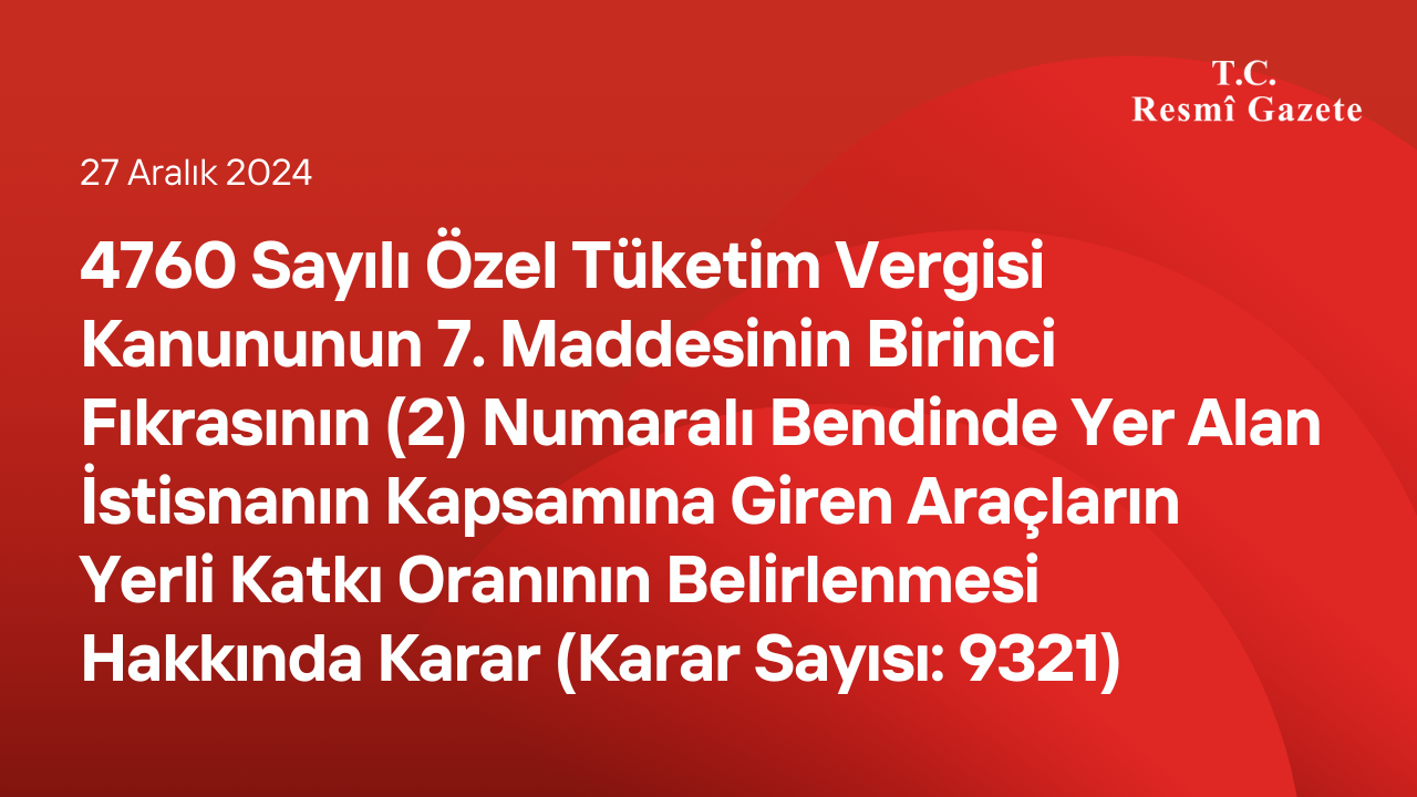 4760 Sayılı Özel Tüketim Vergisi Kanununun 7 nci Maddesinin Birinci Fıkrasının (2) Numaralı Bendinde Yer Alan İstisnanın Kapsamına Giren Araçların Yerli Katkı Oranının Belirlenmesi Hakkında Karar (Karar Sayısı: 9321)